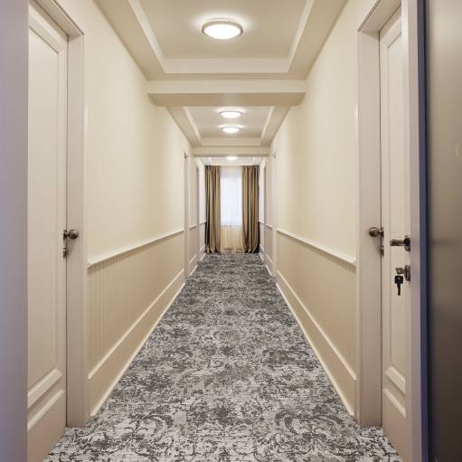Wzory melanżowe i mikrogeometryczne maskują drobne zabrudzenia, a równocześnie wyglądają nowocześnie. W korytarzach świetnie działają delikatne „flow” lub gradientowe pasma, które naturalnie prowadzą do numerów pokoi. W pokojach – spokojniejsze runa, które nie męczą wzroku. Pamiętaj o kontraście jasności (LRV) między podłogą, listwą i ścianą – goście łatwiej orientują się w przestrzeni, a bagaże rzadziej obijają ściany.